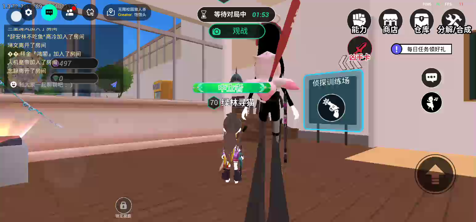 精选地图-无限校园狼人杀 *************这是一场校内角色扮演游戏,我们使用的都是玩具刀枪************* *************游戏行为请勿带进现实模仿******************** 游戏背景:校园突发神秘事件?!身处其中,你的身份是什么?平民?侦探?或是凶手! 欢迎游玩 在这里,每种身份都有独特的获胜方式,快来体验吧!