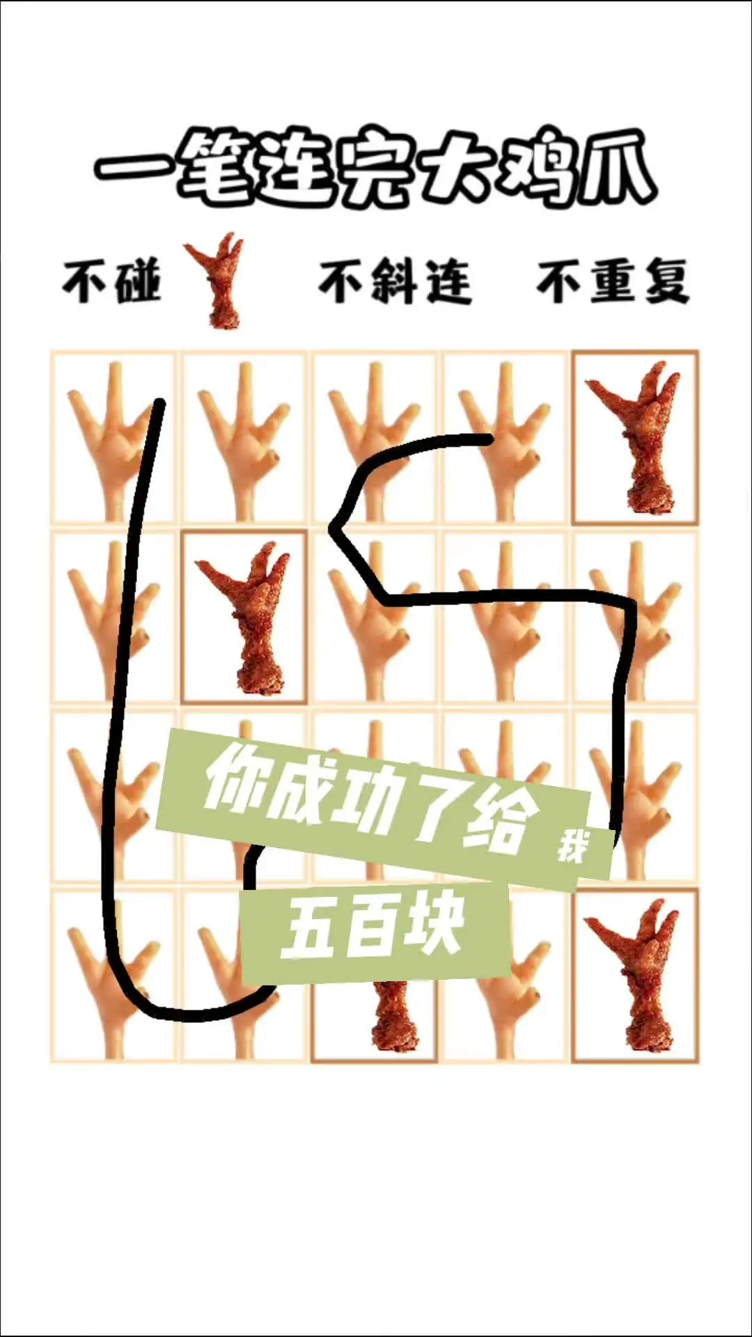 这是一则“一笔连完大鸡爪”的挑战帖,要求不碰卤鸡爪、不斜连、不重复,楼主展示了自己的连线思路,称自己脑筋好使,完成了该连线挑战。