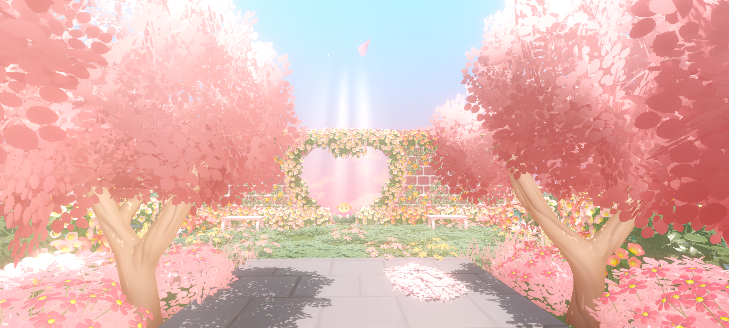 穿过粉粉嫩嫩的桃花林可以看到花墙,很有氛围感的打卡点呢~连光的照射的是超美的弧度,打卡超惊艳啊,很温柔的感觉🎀