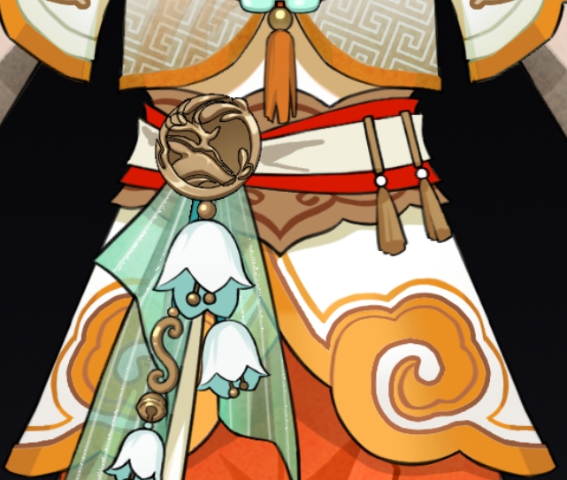 时装以传统服饰为底,配色用了橘色的渐变,腰间铃兰和各式配饰的加入更能突显作为传统瑞兽的形象。