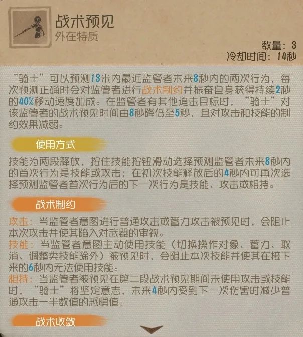 “骑士”可以预测13米内监管者未来8秒内的两次行为,每次预测成功都会对监管者进行“战术制约”,并且自身获得持续2秒的40%移动速度加成。当监管者在追击其他目标时“战术预见”时间由8秒降低至5秒,并且减弱“战术制约”的效果。