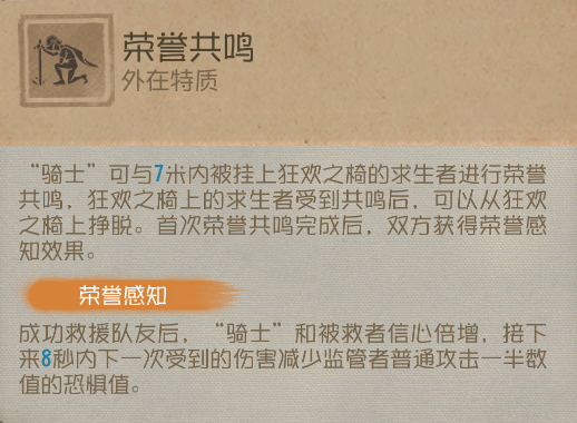 “骑士”可与7米内的上椅求生者进行“荣誉共鸣”,“荣誉共鸣”后上椅求生者会从狂欢之椅上挣脱。首次“荣誉共鸣”后“骑士”与被救援队友会获得“荣誉感知”。