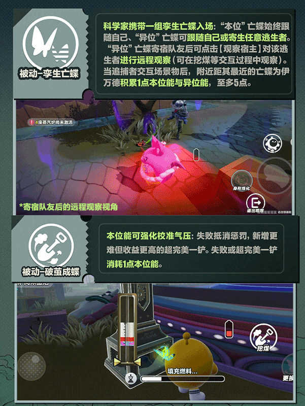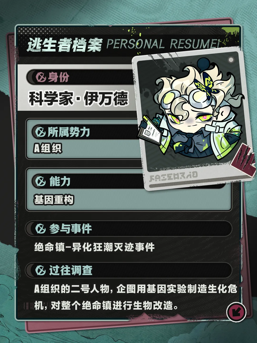 ■4月4日(周五),“逃出惊魂夜”全新逃生者-科学家·伊万德即将上线,技能介绍&角色故事释出,一同感受这位疯狂科学家的魅力!