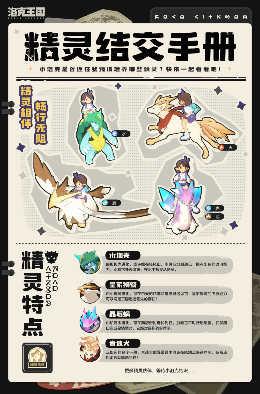 面对各式各样的精灵仍在犹豫手中的咕噜球该投向谁?别着急,这里有一份专门为小洛克准备的:《精灵结交手册》。