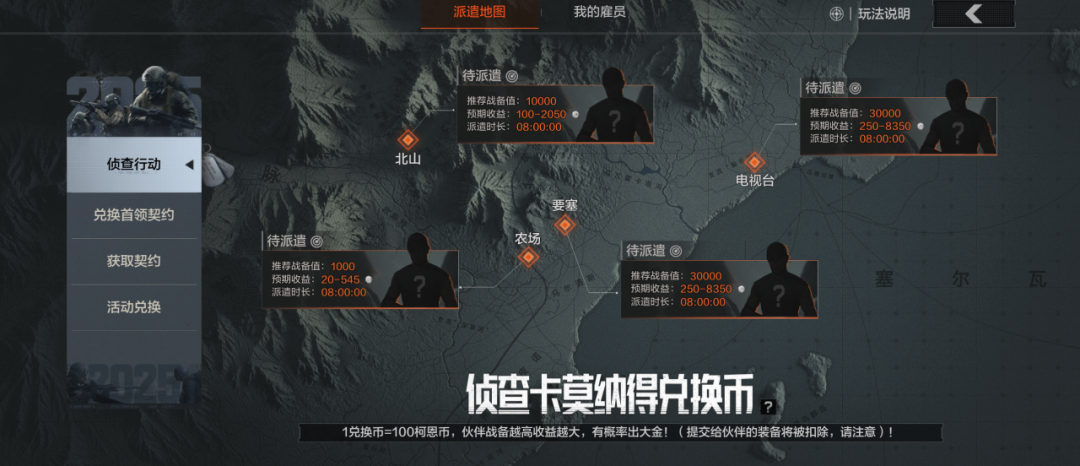 活动期间,派出伙伴侦查卡莫纳,可带回兑换币,1兑换币=100柯恩币,伙伴战备越高的话收益越大,还有概率出大金!
