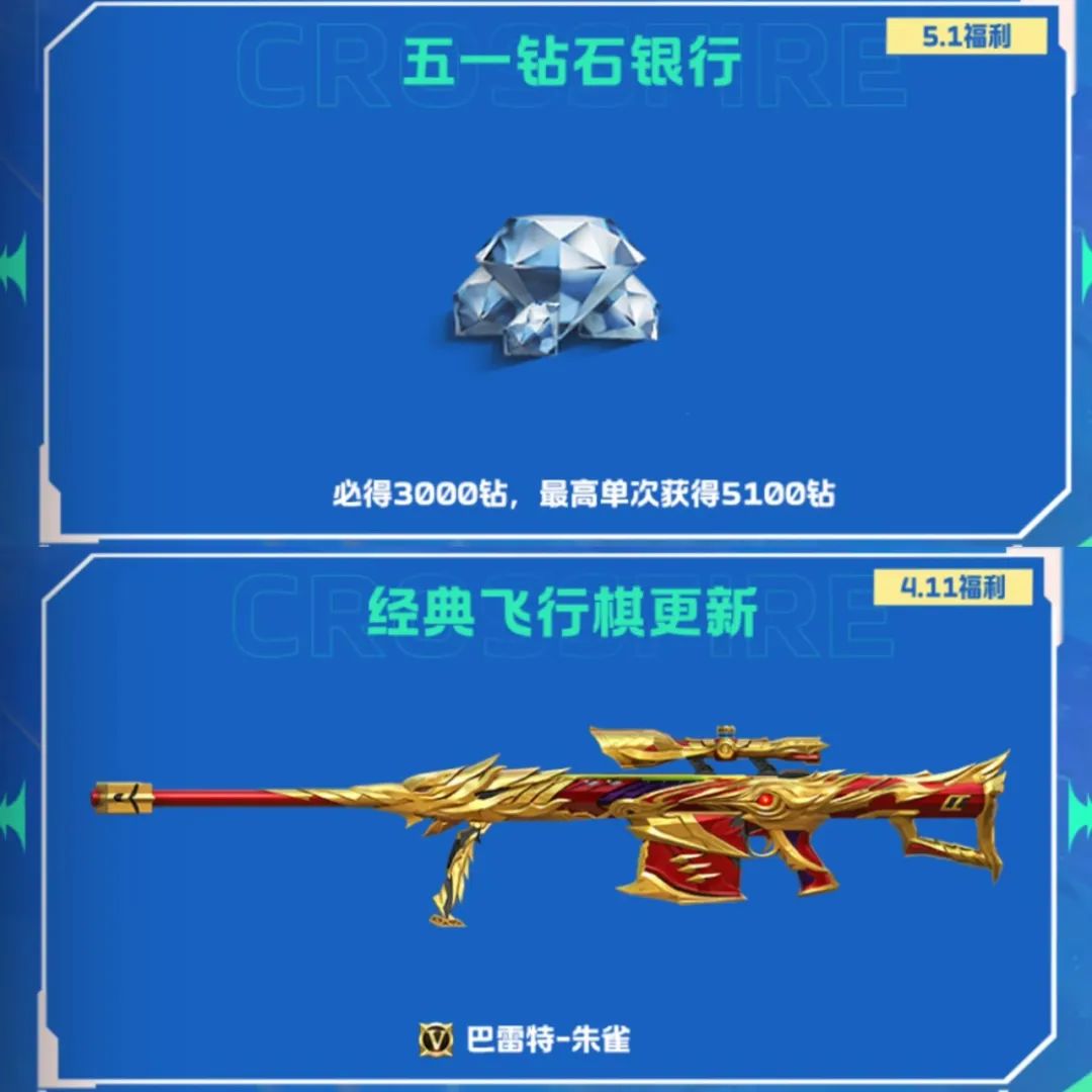 钻石银行活动又来啦,为了帮助大家更快拿到心仪的道具,福利是层层加码,保底从以往的每次500增至1000,最终必得3000钻石,最高更是可以单次获得高达5100钻石!经典飞行棋将上架复刻端游的经典神器——巴雷特-朱雀,金色与红色交相辉映,火羽展翅的造型更显张扬恣肆,是一把不可多得的大杀器!