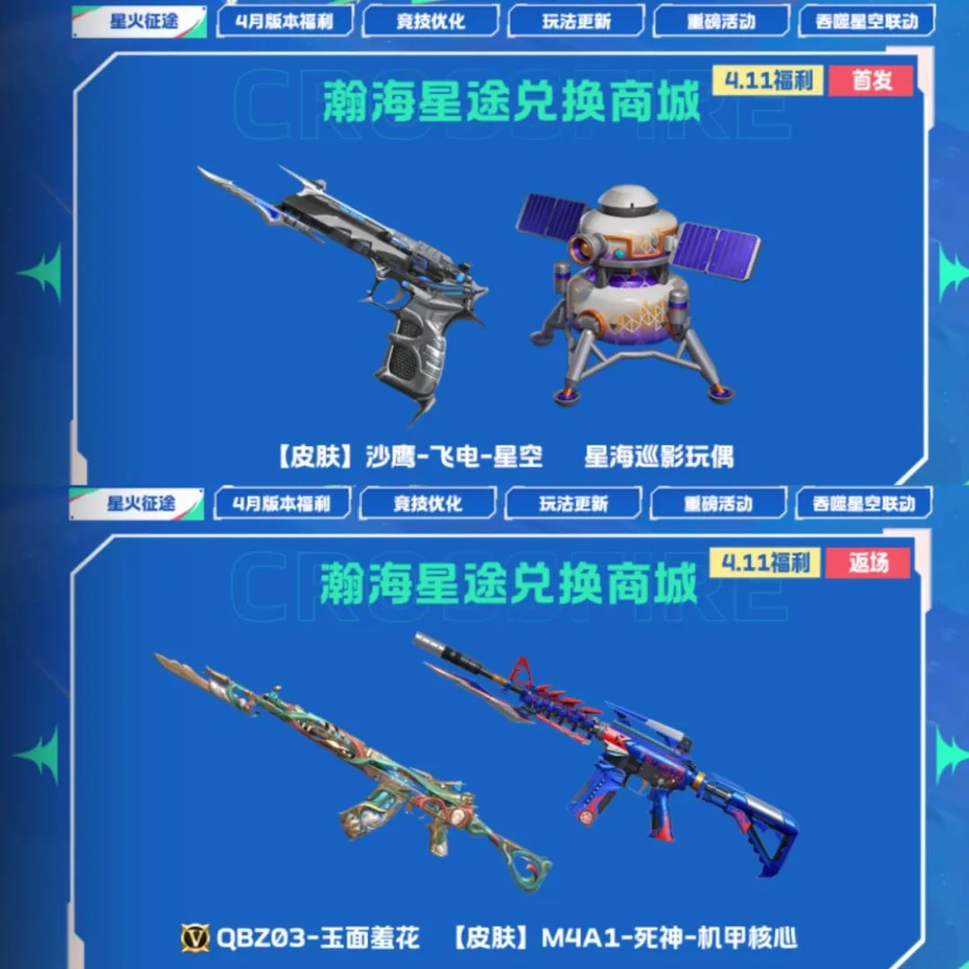 瀚海星途兑换商城首发【皮肤】沙鹰-飞电-星空和星海巡影玩偶,并且将会返场QBZ03-玉面羞花以及【皮肤】M4A1-死神-机甲核心,春意盎然和科技力量交相呼应。
