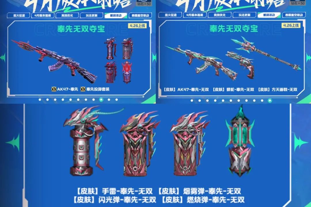 奉先无双夺宝将首发奉先投掷套装及其无双皮肤,以及副武器和近战的无双皮肤,返场AK47-奉先和【皮肤】AK47-奉先-无双,装备无双皮肤将会让你在战场上所向披靡!