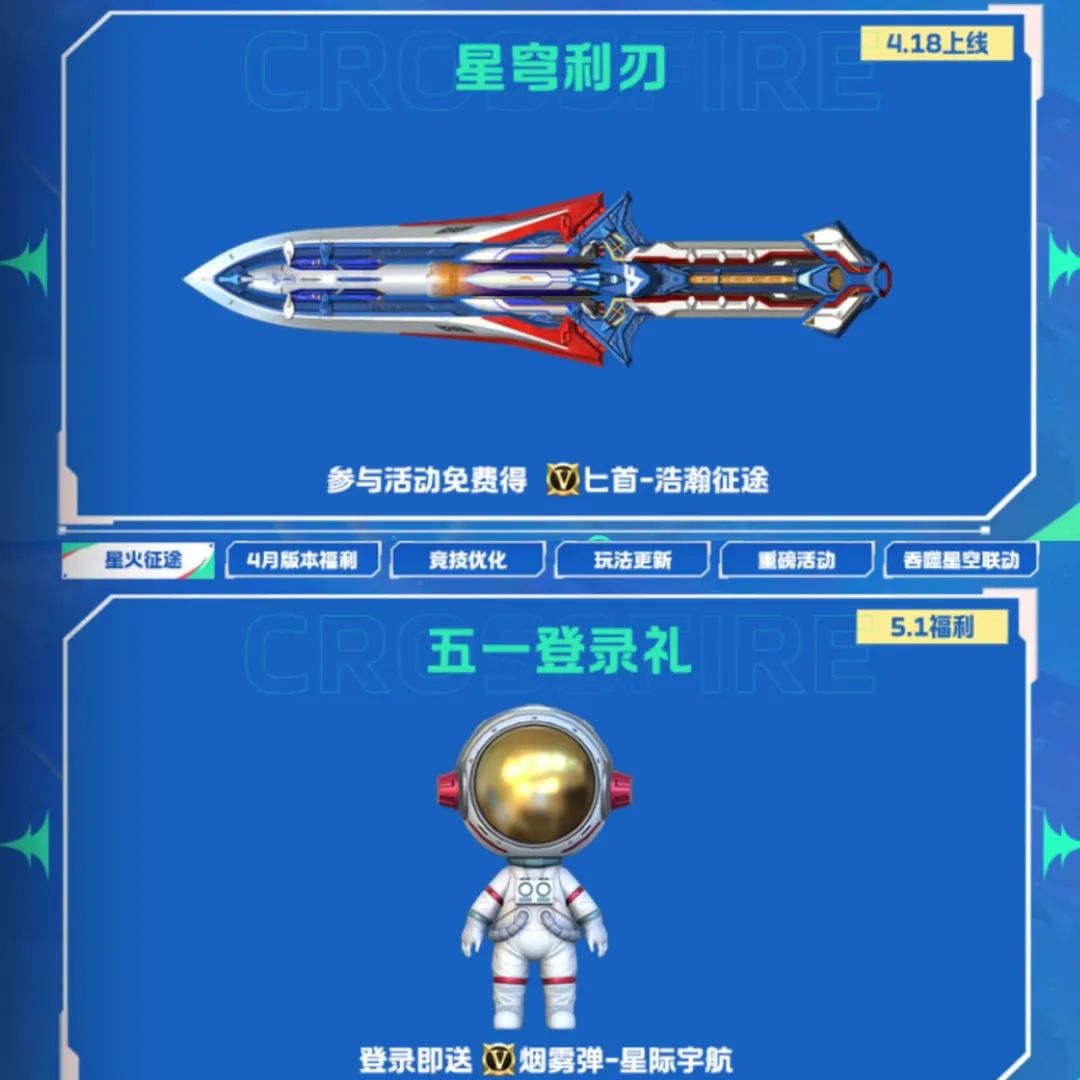 参与活动可以免费得匕首-浩瀚征途,这把匕首改变了往日的匕首风格,乍看似一把大剑,剑身中嵌着火箭,让人爱不释手!五一登录即送英雄级烟雾弹-星际宇航,该烟雾弹是一个宇航服造型,外观很是可爱呢!