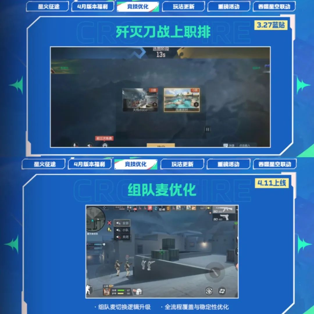 职业排位上架歼灭刀战,擅长刀战的小伙伴们有福啦!组队麦切换逻辑升级,全程覆盖与稳定性得到优化,交流更顺畅!