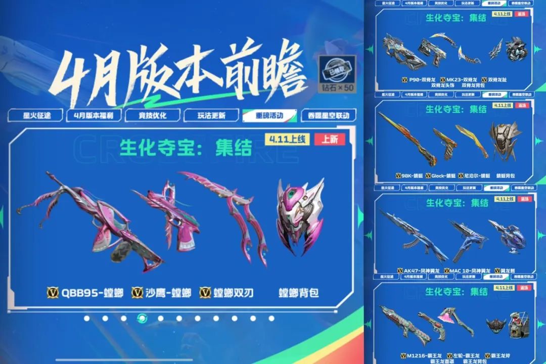 新的生化夺宝将首发QBB95-螳螂、沙鹰-螳螂和螳螂双刃以及螳螂背包,并且返场之前的所有的生化夺宝武器及万化,喜欢生化模式的小伙伴可千万不要错过!