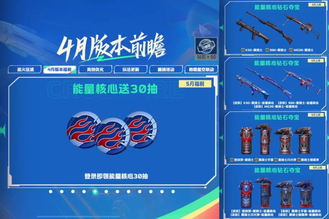 能量核心夺宝即将返场,返场道具有KSG-黑骑士、98K黑骑士和MG36-黑骑士以及全套的黑骑士投掷套装,并且同时返场它们的能量核心皮肤,5月更有登录即送30连抽,小伙伴们可千万不要错过!