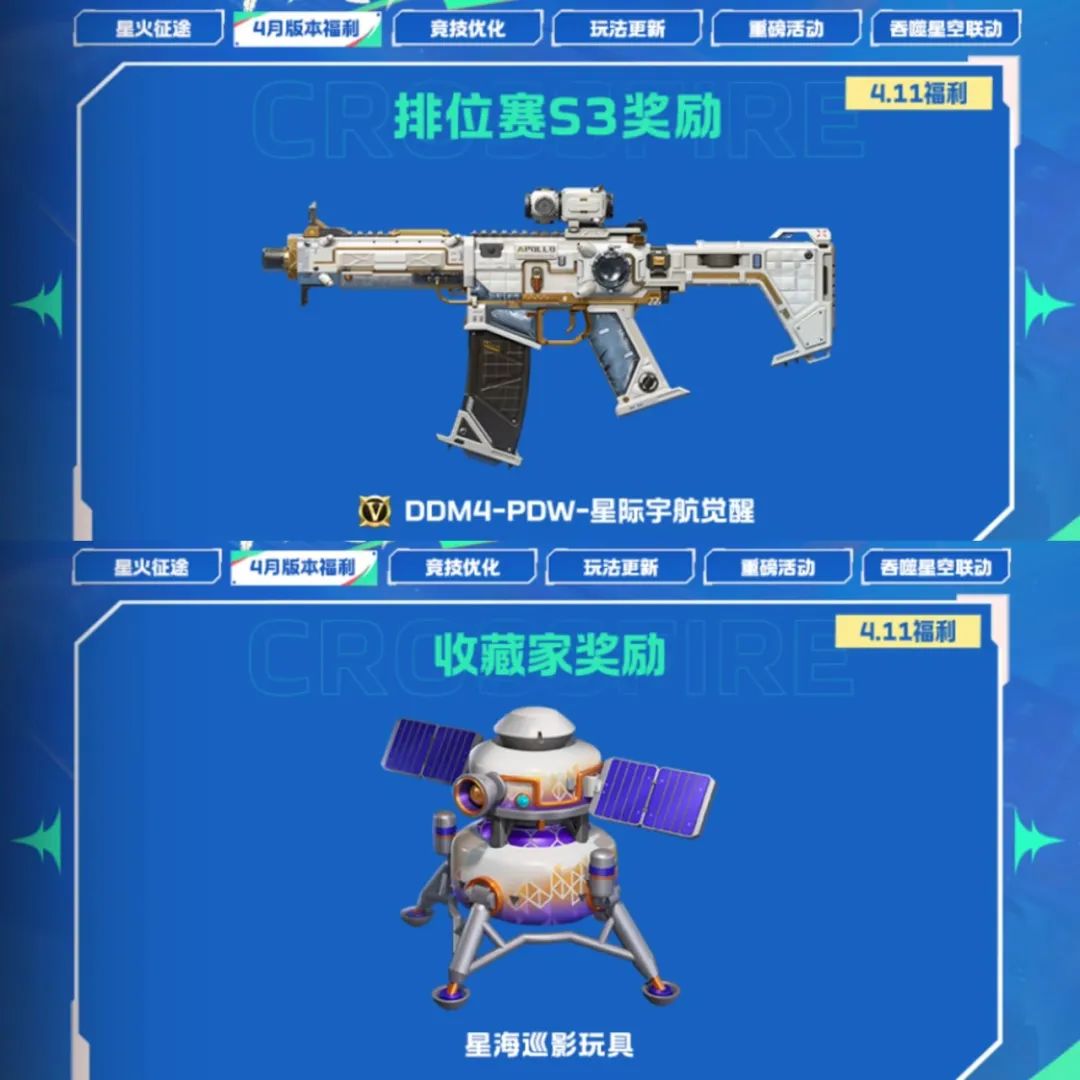 排位赛S3武器为DDM4-PDW-星际宇航,使用觉醒石即可进行觉醒,这是一把冲锋枪,在近距离对敌时拥有不错的表现。收藏家奖励则为星海巡影玩具,是一个卫星的造型,煞是可爱!