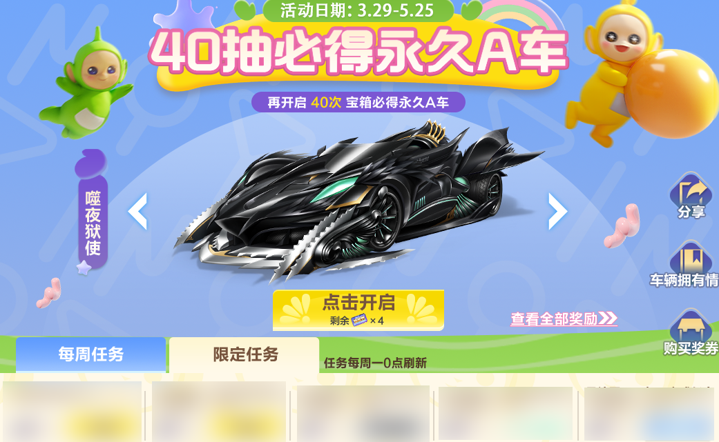 3月29日下午-5月25日,40抽必得永久A车活动即将重磅开启!车手们在活动期间完成指定任务即可获取抽奖券,使用抽奖券累计开启宝箱达40次必得一辆永久A车!