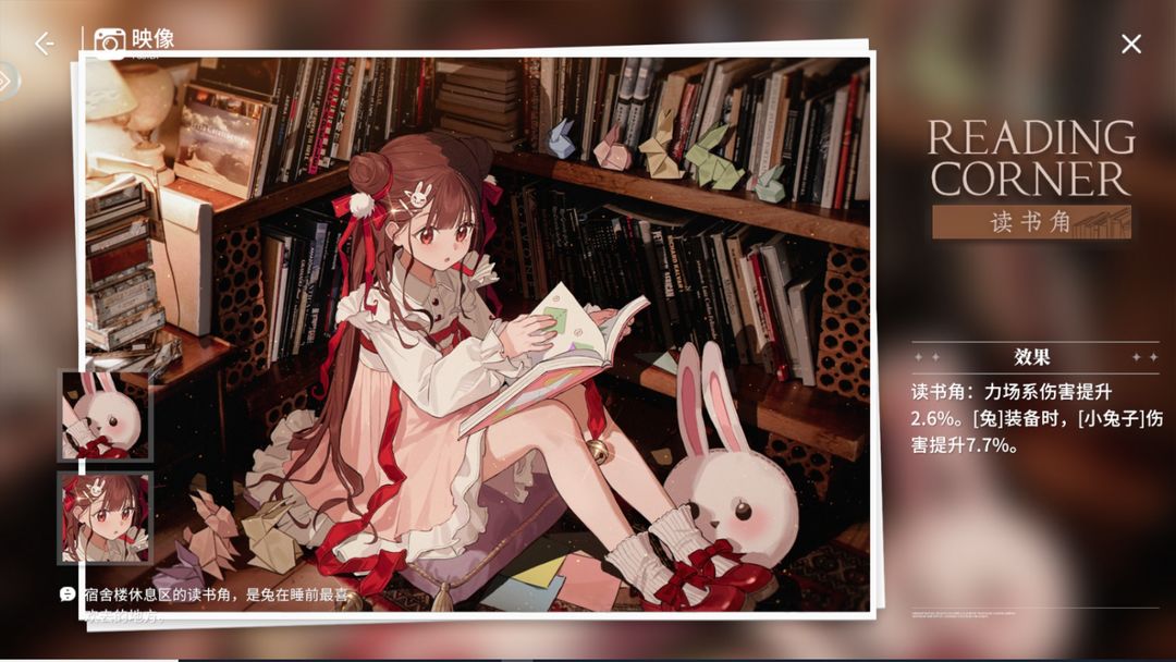 初级效果:力场系伤害提升2.6%。[兔]装备时,[小兔子]伤害提升7.7%。