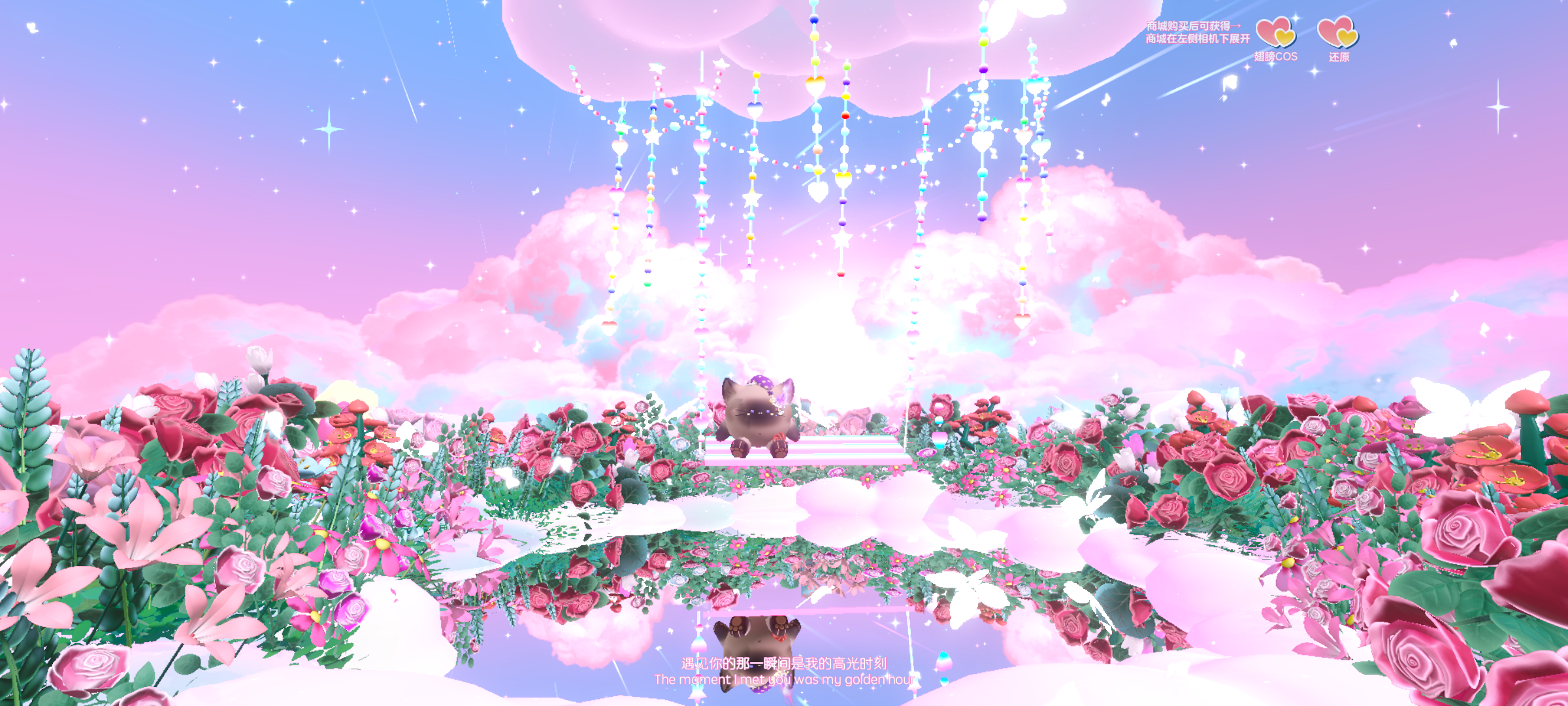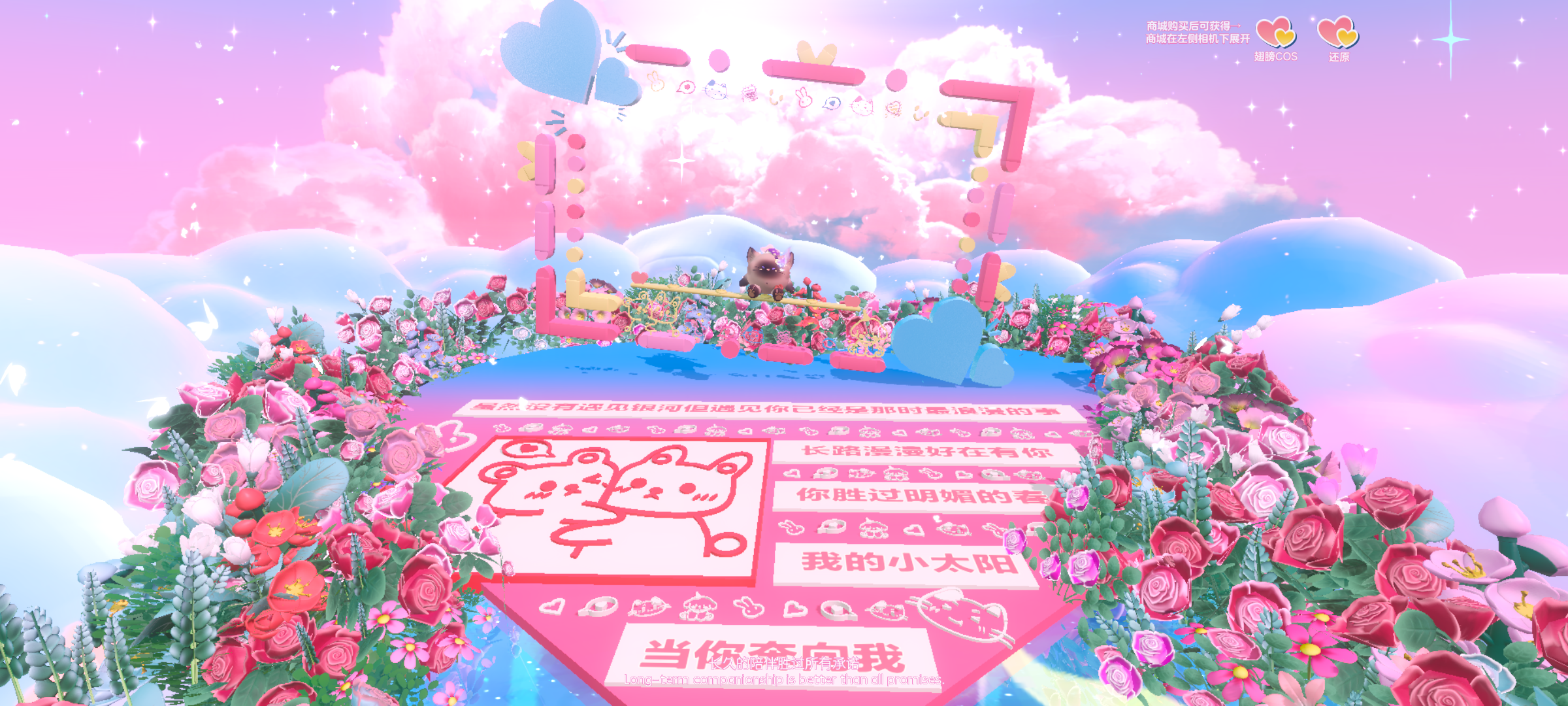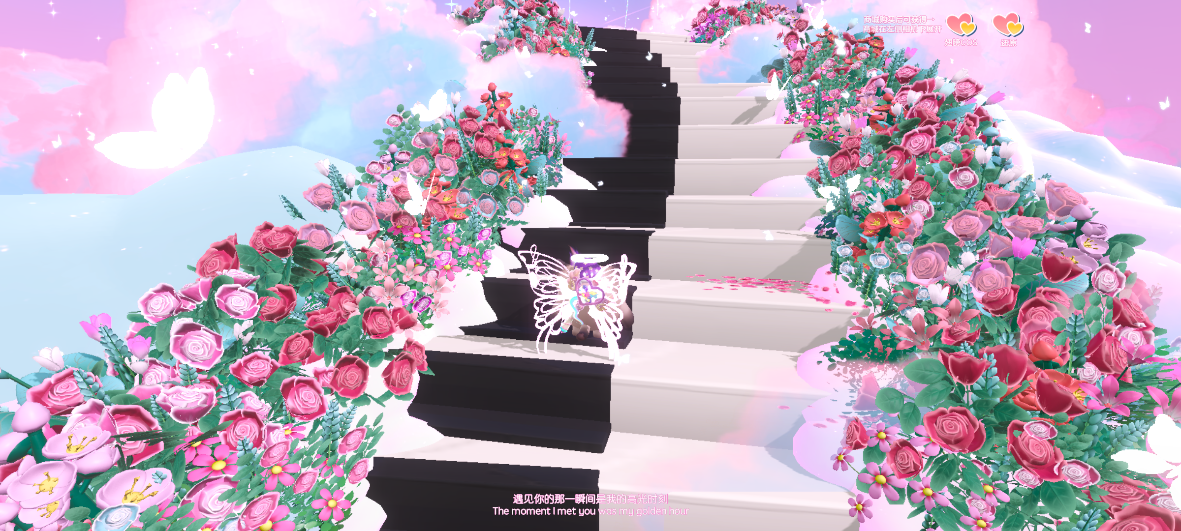 两边都是玫瑰,中间是银河一样的道路,侧边还有粉粉嫩嫩的云朵,简直是少女心的天堂呀~左边的光点是通往下一个打卡点的速通,这里前面走过银河道路打卡完后就可以复位走进光点,到下一个打卡点啦🌷