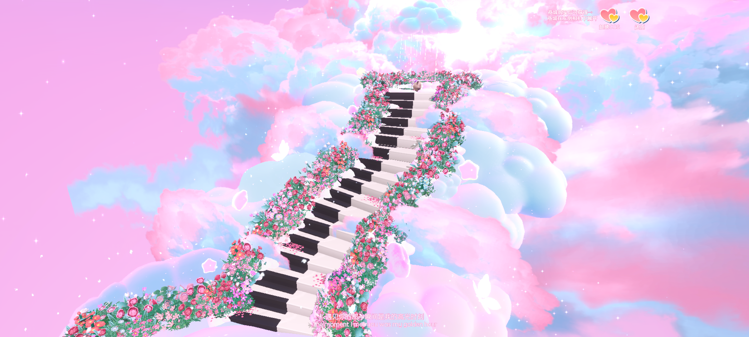 同样也是两边玫瑰,中间的银河换成了钢琴一样的按键,按键组成了阶梯,玫瑰两旁又是超美的天空,还有发光的蝴蝶呢,就像在仙境一样💕