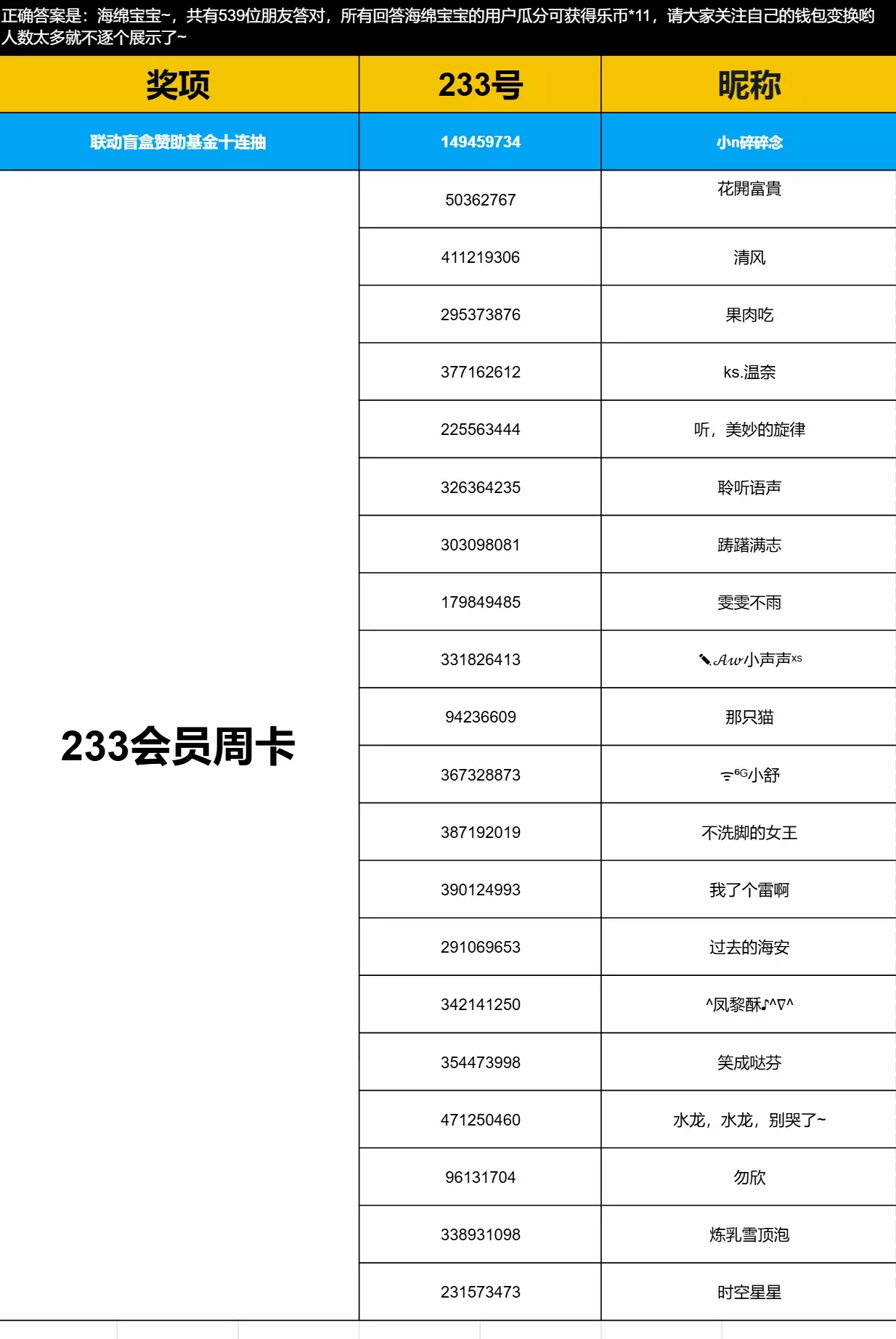 随机抽取正确参与用户(20名)获得233乐园会员周卡