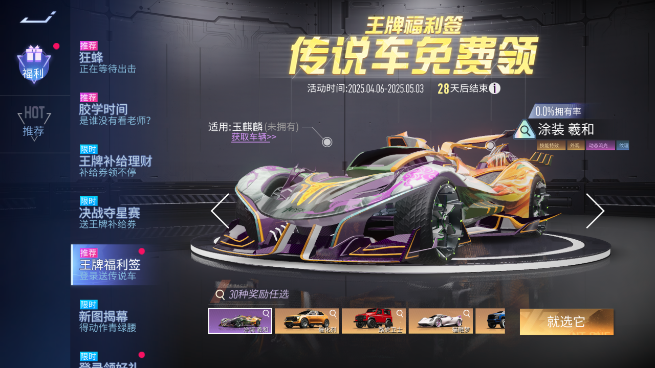 『王牌福利签』免费领传说车!4月6日~5月3日,车手们选择奖励后可开启活动,累计登录12天即可领取最终奖励!玉麒麟、幻蝶、月宫舞灵等传说车辆,等你来领!