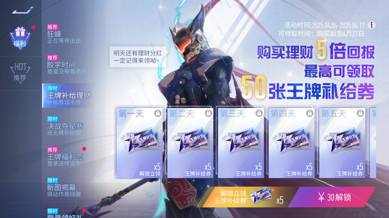 『王牌补给理财』王牌补给理财来了!4月4日~4月17日活动期间,购买理财得5倍回报,车手们一共可领取50张王牌补给券,超值理财不容错过呦~