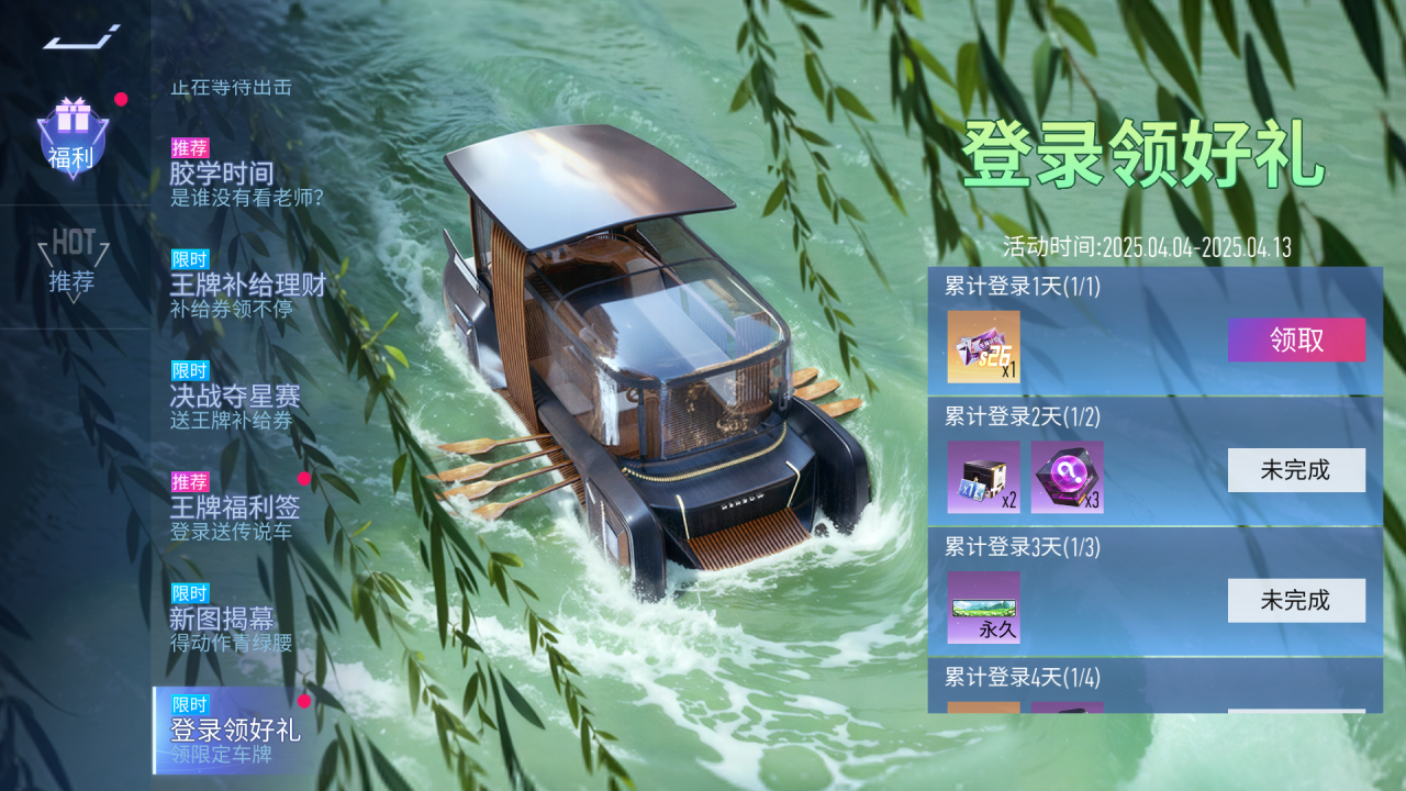 『登录领好礼』小长假登录有礼!4月4日~4月13日,登录即可领取王牌补给券、限定车牌、零件自选包等好礼!