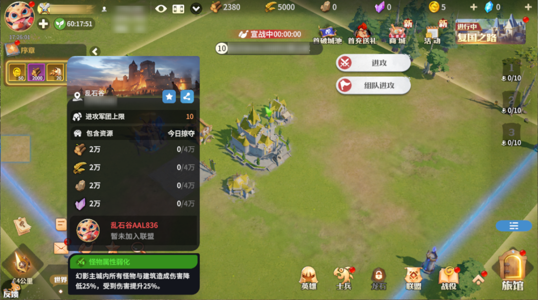 幻影主城玩法于次日世界之石开启,击败幻影主城的资源建筑,可获得对应的资源奖励,每日可获取资源的上限与主堡等级相关,进攻次数不限。