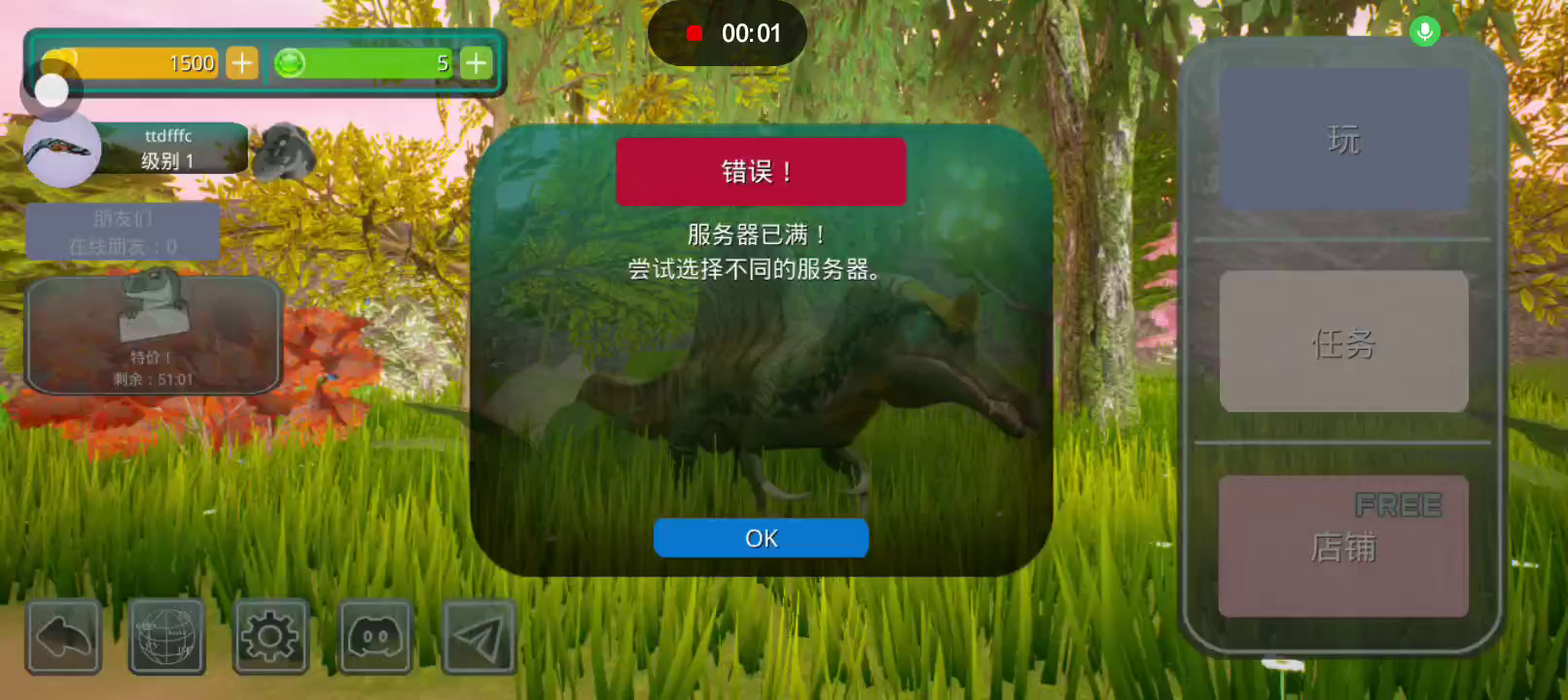 更新: -重爪龙已被似鳄龙取代 -改进了所有恐龙的咆哮动画 -步行动画根据操纵杆进行调整 -为恐龙增加了撞击、冲锋咬合能力 -风神翼龙可以将恐龙举到空中 -增加大量被动技能 -地图改进 -修复错误并提升性能 恐龙岛是一款以侏罗纪世界为背景的逼真在线恐龙模拟器。 享受各种恐龙、逼真的图形和岛屿大地图。 选择你的恐龙并开始生存, 与您的朋友以及世界各地的玩家一起玩。 游戏中呈现了所有流行的恐龙,例如,从霸王龙、棘龙等食肉动物开始,到三角龙、甲龙等食草动物,游戏中有超过 23 种恐龙,包括飞行和游泳物种,以及所有恐龙。 如何玩诅咒岛 肉食性恐龙在线模拟器 - 恐龙生存和狩猎的游戏特色: 1.成长系统! 恐龙不会立即显得很大,需要照顾。 你需要培养他。你需要生存、寻找食物和饮料,并避免来自其他肉食恐龙(例如巨龙、重爪龙或暴龙)的潜在威胁。 2. 首先,玩家需要选择一种恐龙。 请记住 - 这是您个人的恐龙! 在恐龙游戏中,不仅有肉食性恐龙和草食性恐龙,还有会飞的恐龙,例如翼手龙,玩家可以与自己物种的食肉动物联合成群,以抵抗其他物种,最重要的是,生存! 3.食物提取,如果恐龙是掠食者,那么你需要杀死其他玩家的恐龙才能得到自己的食物,如果你是草食动物,那么食物就更容易了,你需要特殊的蕨类植物,你可以得到足够的他们! 地图上任意湖泊、水库都可以饮用。 4.文字聊天和好友系统。 您可以与世界各地的朋友和玩家聊天、制定策略、缔造和平等等。 并且还可以将玩家添加为好友,并加入到游戏的骨架中