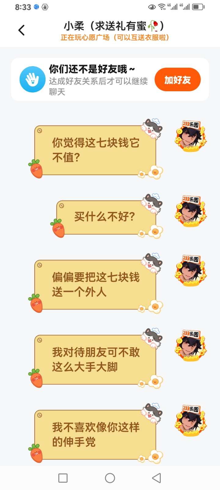 不是啊,小姐姐,不是我不送你而是你所要的太贵,我们还是陌生人,好吧,你觉得我上来会送你700币的东西吗?有点迷惑哈,纯吐槽一下,我又不是人傻钱多的主子,一天一个迷惑人...