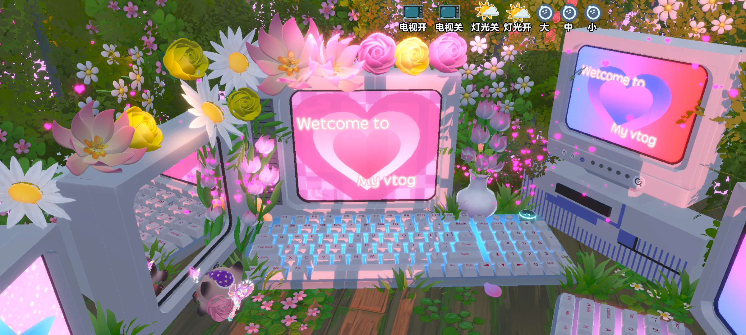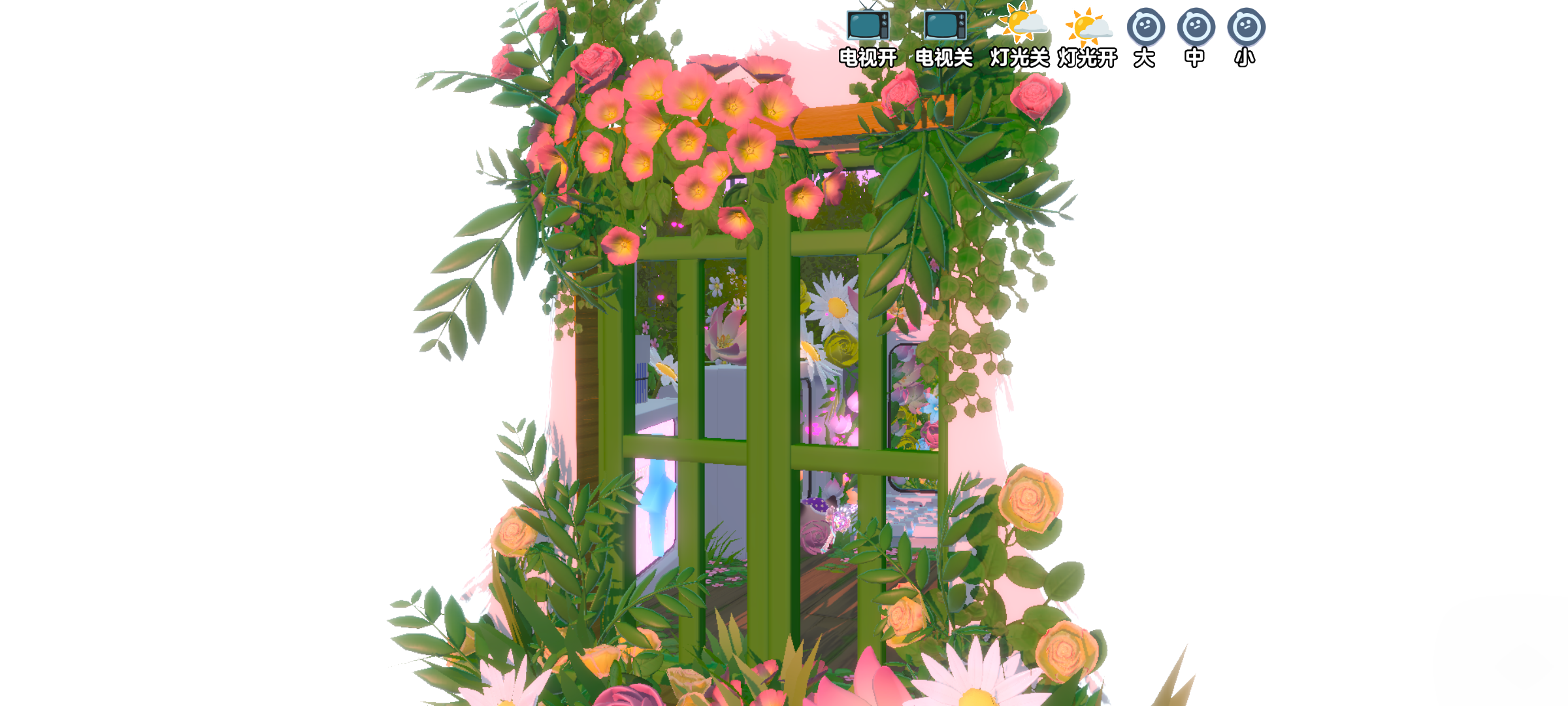 这里外边看是一个电话亭,进入后就是超级美的电视和花花啦,到这里后右上角会有添加的按钮,可以选择电视机开关和灯光开关,灯光开关都很好看哦~电视机关着是爱心的图案,开着也是一样的美💫