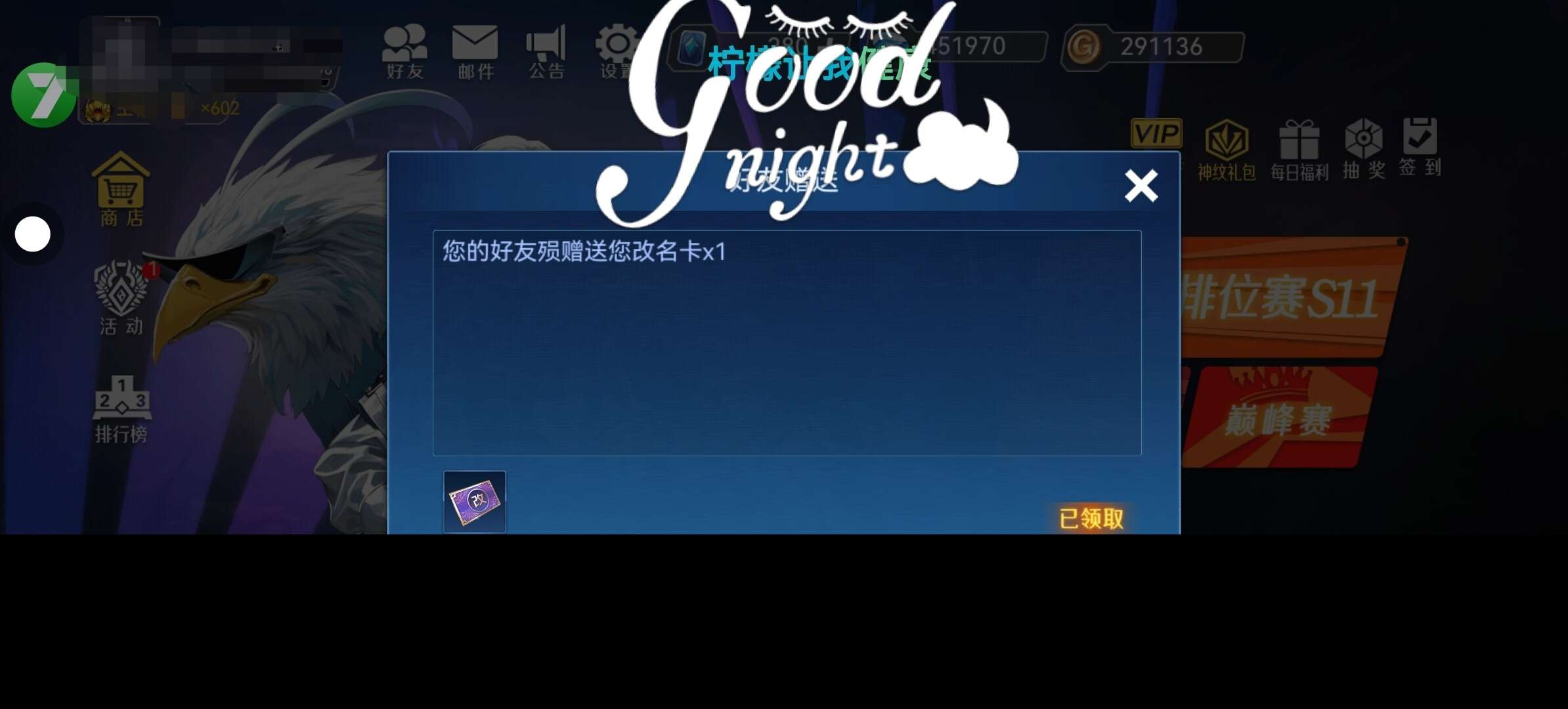 真是一个美好的夜晚《good night》,🙂❤️前有师父陪我玩,后有人送我改名卡真的是太有生活了
