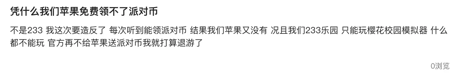 不是233 我这次要造反了 每次听到能领派对币 结果我们苹果又没有 况且我们233乐园 只能玩樱花校园模拟器 什么都不能玩 官方再不给苹果送派对币我就打算退游了