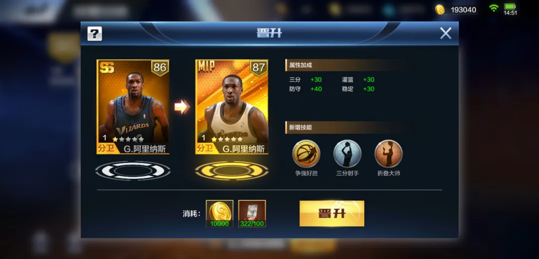 阿里纳斯晋升后,三分、稳定、灌篮属性+30、防守属性+40;技能上,争强好胜升至10级、三分射手升至7级、新增4级折叠大师!无论是突破、还是投射都变得更加强势!