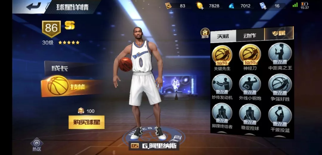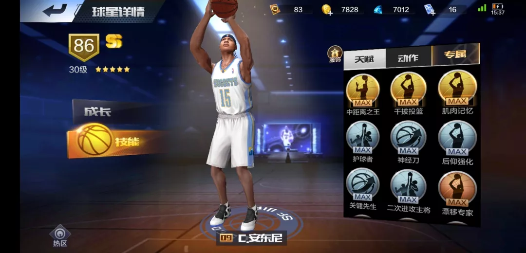 安东尼的天赋技能10级的有中距离之王和干拔跳投;7级的有二次进攻主将,关键先生,护球者,后仰强化和神经刀;安东尼的动作有靠打转身,靠打跳步,过人后跨步,拉杆上篮,过人后撤步和假投真传等超多实用动作!