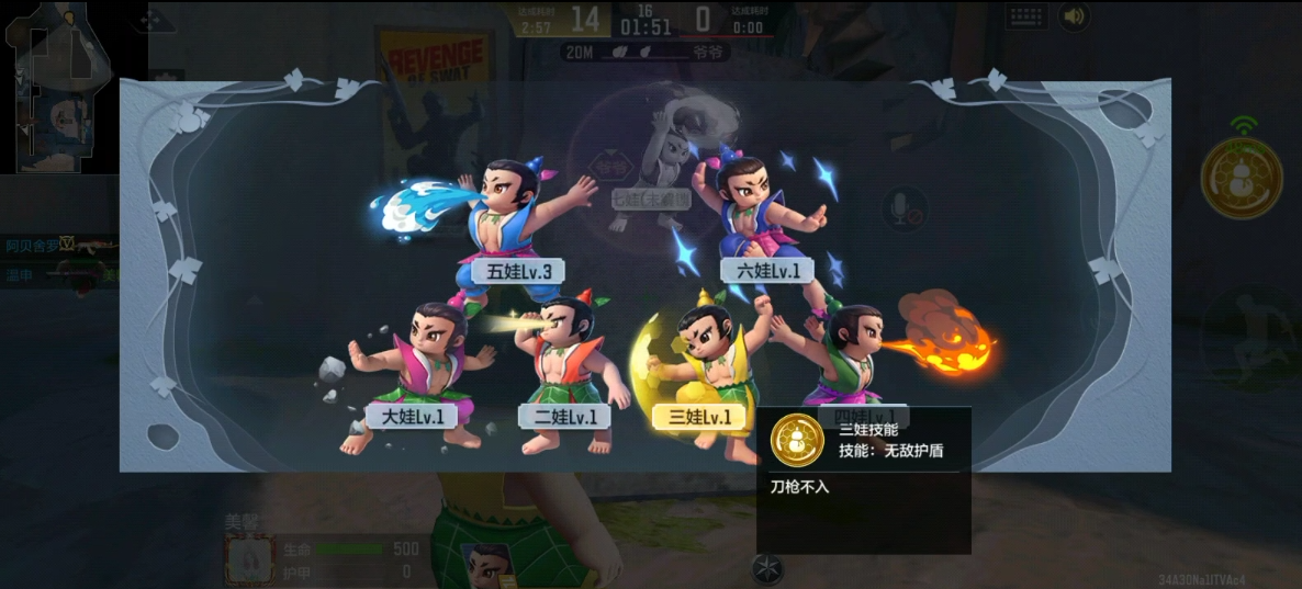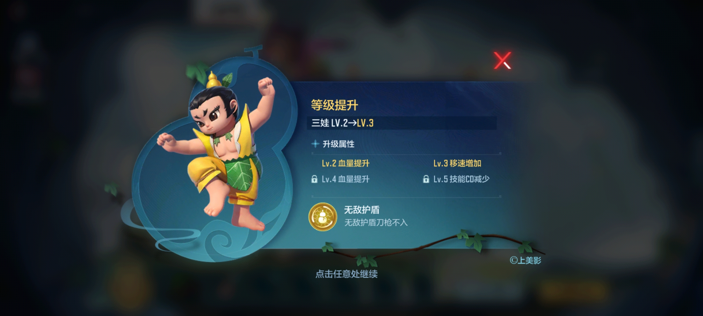 葫芦娃中的三娃拥有无敌护盾技能,点击技能三娃周围会形成无敌护盾且刀枪不入,不过护盾时间较短,需要玩家掌握好技能释放的时间,同时升级后三娃会在血量、移速上有所提升,更重要的是升到5级,技能的CD时间会减少。