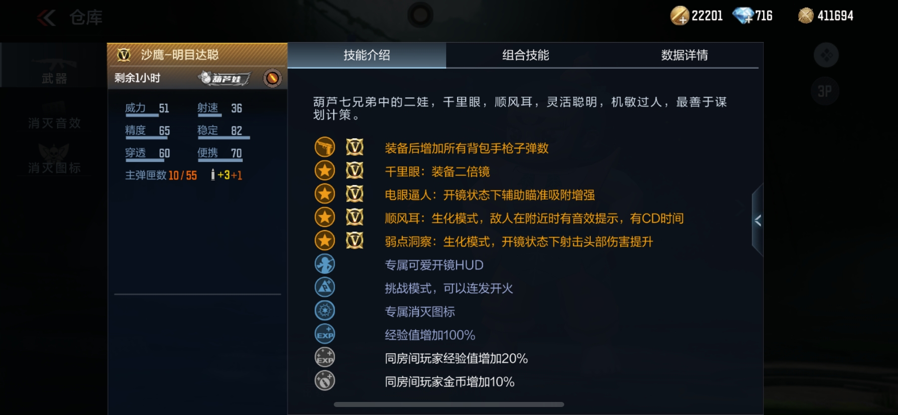 这是一把可以开镜的副武器,拥有千里眼:装备二倍镜;电眼逼人:开镜状态下辅助瞄准吸附增强;顺风耳:在生化模式中,敌人在附近时有音效提示,有CD冷却时间;弱点观察:在生化模式中,开镜状态下射击头部伤害提升。