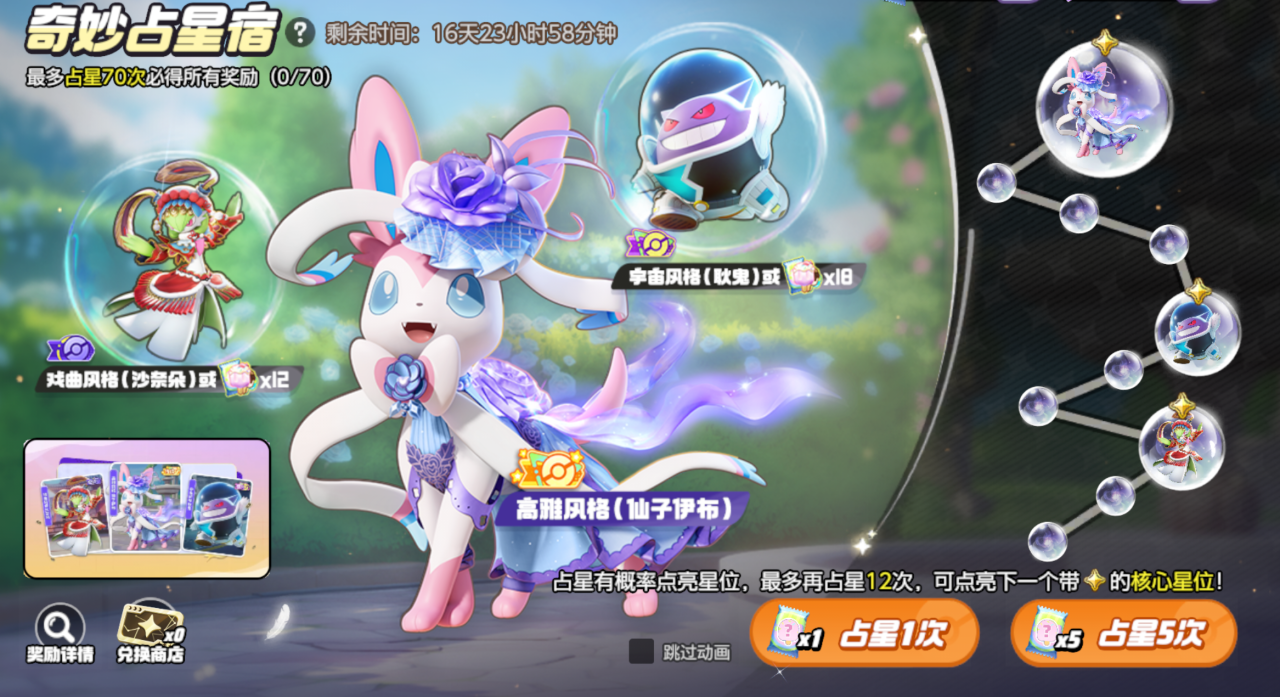 本期“奇妙占星宿”活动先开启返场的是电子服占星活动,有高雅风格仙子伊布、宇宙风格耿鬼、戏曲风格沙奈朵三款电子服可供训练家们获取。