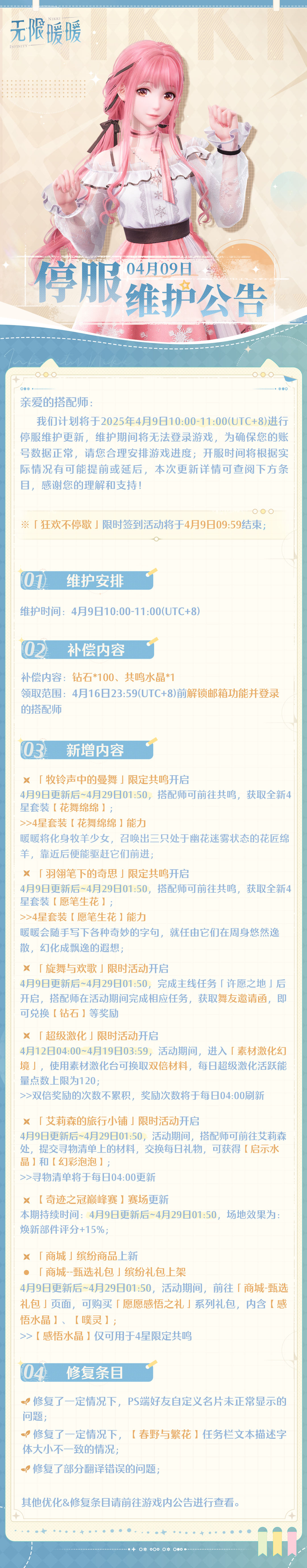 💡本次维护可得「钻石*100、共鸣水晶*1」的维护补偿噢(๑´ڡ`๑)~