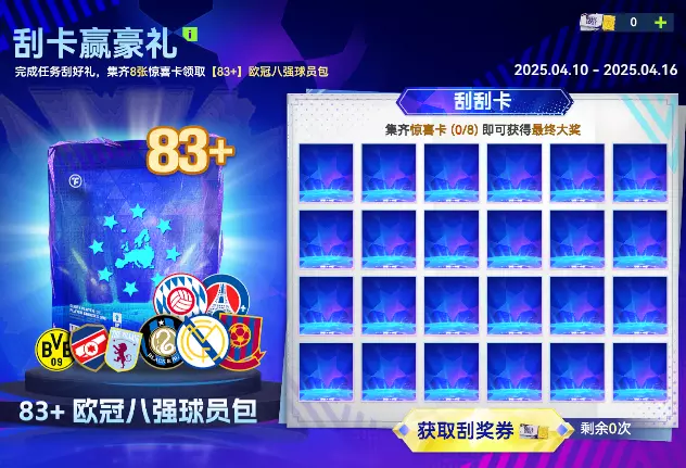 完成任务刮好礼,集齐8张惊喜卡领取【83+】欧冠八强球员包。