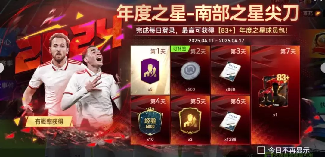 完成每日登录,最高可得【83+】24年度之星球员包。