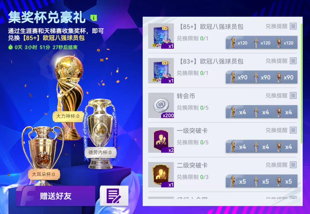 活动期间,参与生涯赛和天梯赛可随机获得大力神杯、德劳内杯和大耳朵杯 ,每日获取上限各为20个,集齐指定奖杯可兑换包含【85+】欧冠八强球员包在内的丰厚奖励。
