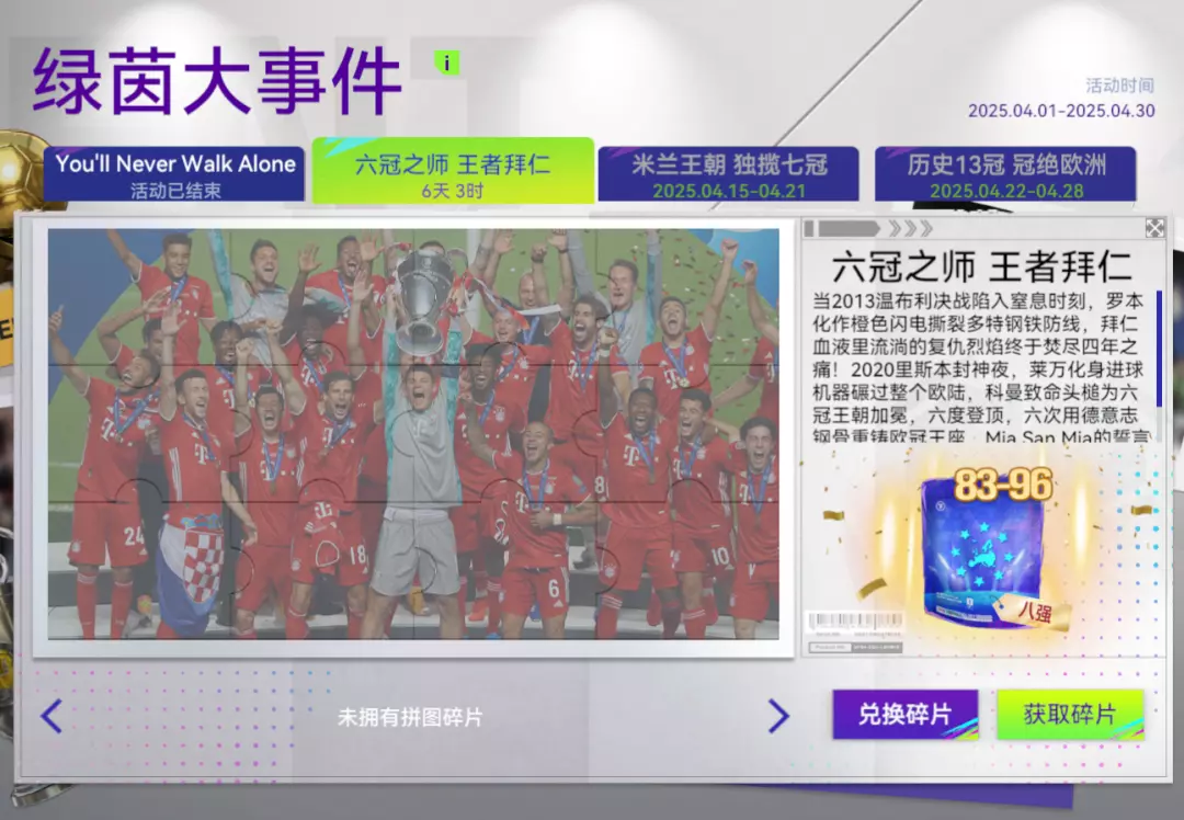 活动期间,完成指定任务获得事件碎片,使用事件碎片完成事件拼图后可获得【83+】欧冠八强精选包。
