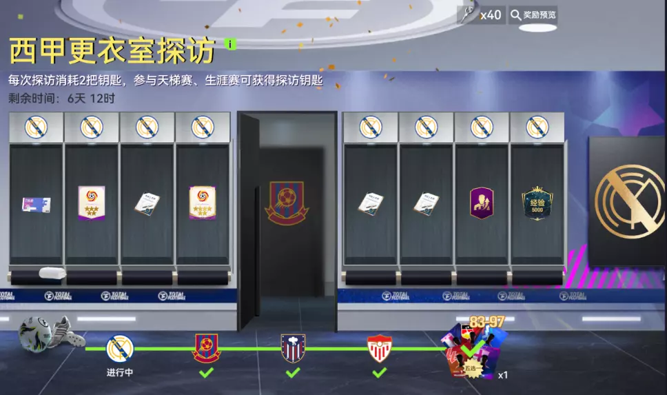 2.消耗探访钥匙可打开更衣室柜子,每个柜内均有奖励,如在柜子中找到球会钥匙,即可前往下一间;