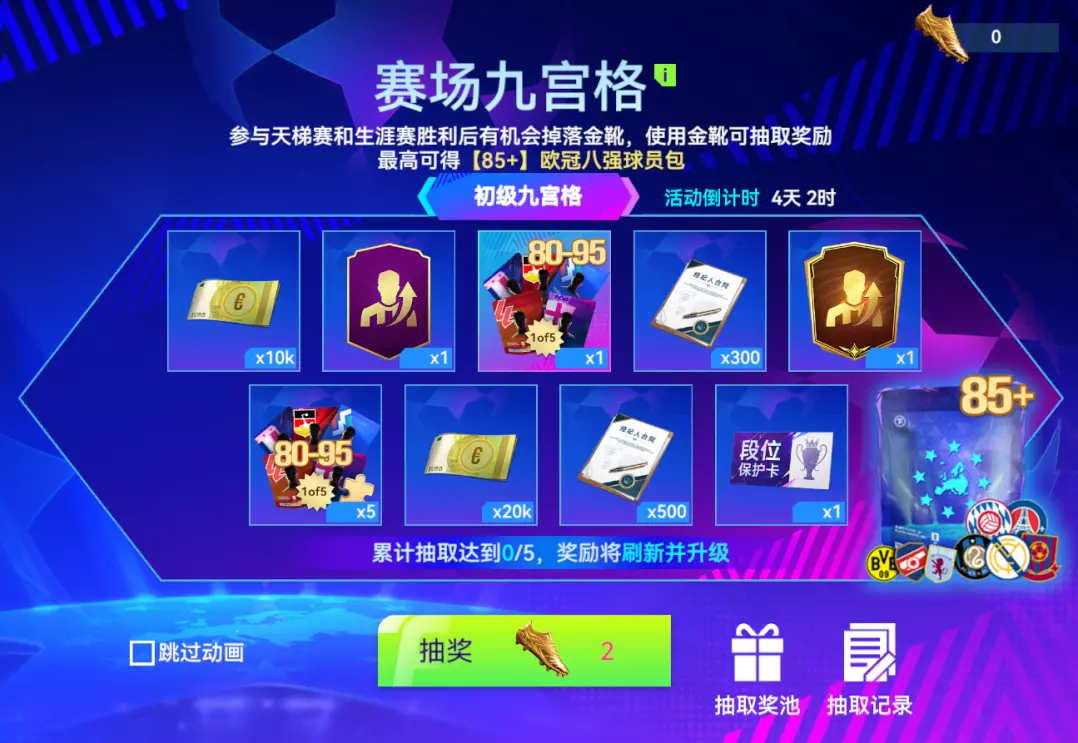 活动期间参与天梯赛和生涯赛有几率获得金靴,使用金靴可以在赛场九宫格活动内抽取奖励,最高可得【85+】欧冠八强球员包。