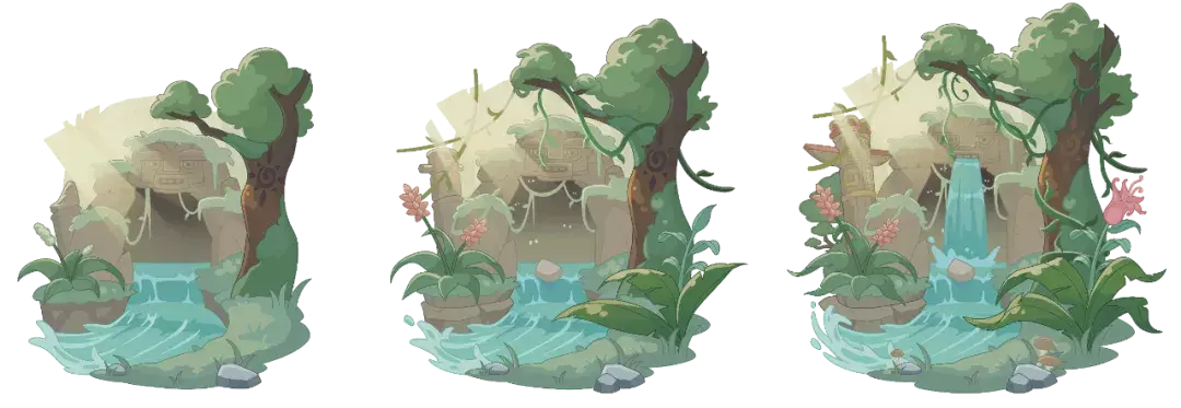 背景设计上,强化热带丛林的氛围感,呈现出生机勃勃又潮湿神秘的特点,潺潺溪水流淌,反射着点点光晕,远处的遗迹与雕像仿佛时间的看客,旁观怀有好奇心的一位位探险者们的出现与离开;