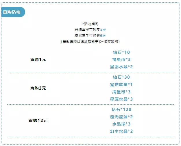 限时直购福利活动开启!4月11日-4月13日,车手们可以用超值价格将钻石、星愿水晶、摘星币、宠物能量、橙光能源、幻生水晶、水晶球一并收入囊中!
