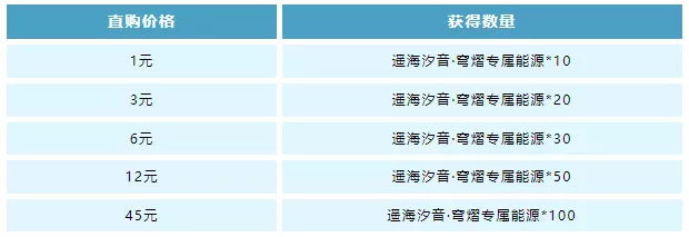4月11日-5月5日,车手们还可以用优惠的价格直购获得超多遥海汐音·穹熠专属能源,共计可得遥海汐音·穹熠专属能源*210!活动期间每个价位限购1次,快来和小橘子一起看看吧~