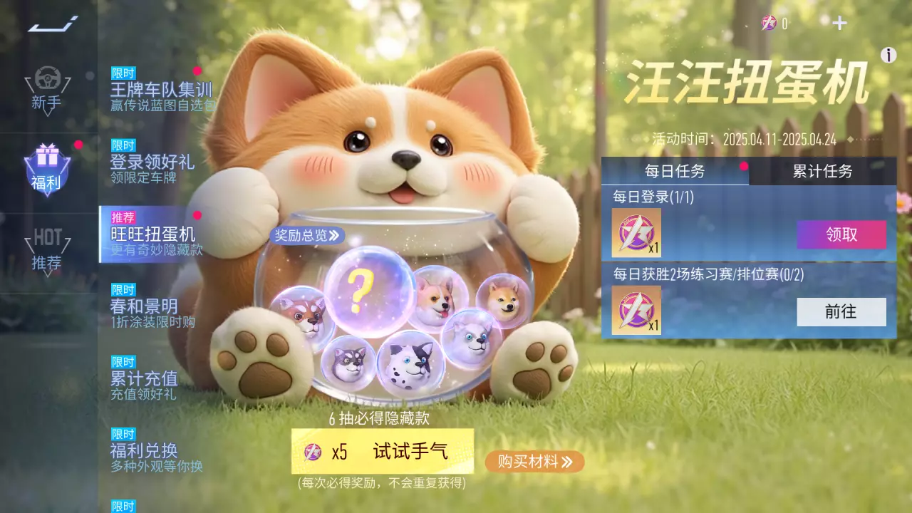 带上旺头套,今年一定旺!4月11日-4月24日,旺旺扭蛋机惊喜来袭!完成对应任务领取扭蛋币即可参与抽奖,多款可爱的狗狗头套等你来拿。听说还有特殊隐藏款时装等待有缘人来揭晓!