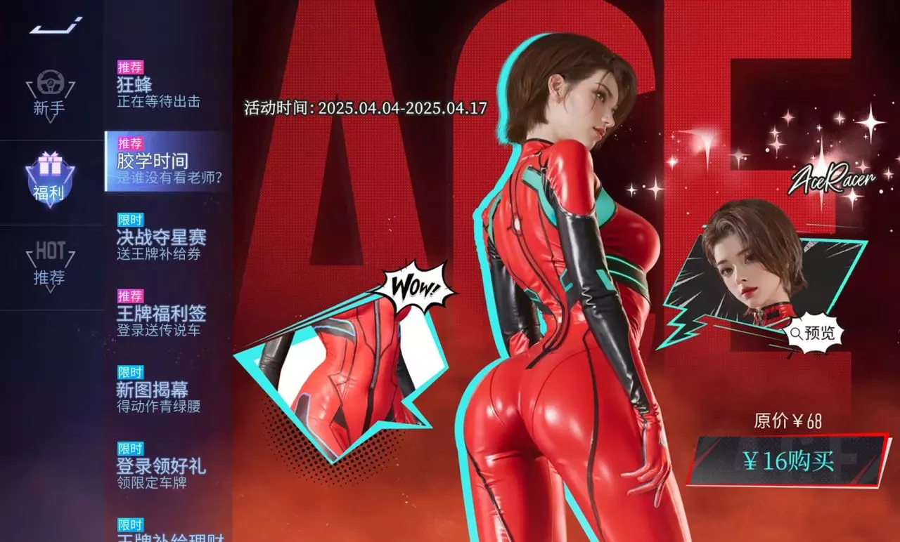 各位车手,我宣布现在是. . .胶学时间!4月4日~4月17日,全新时装:胶学时间,上架福利活动,无限的能量喷涌而出,直至达到超低价!