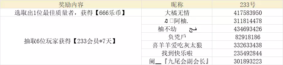 以回帖盖楼为形式,官方随机在总楼层数中抽取6位玩家获得【233会员*7天】