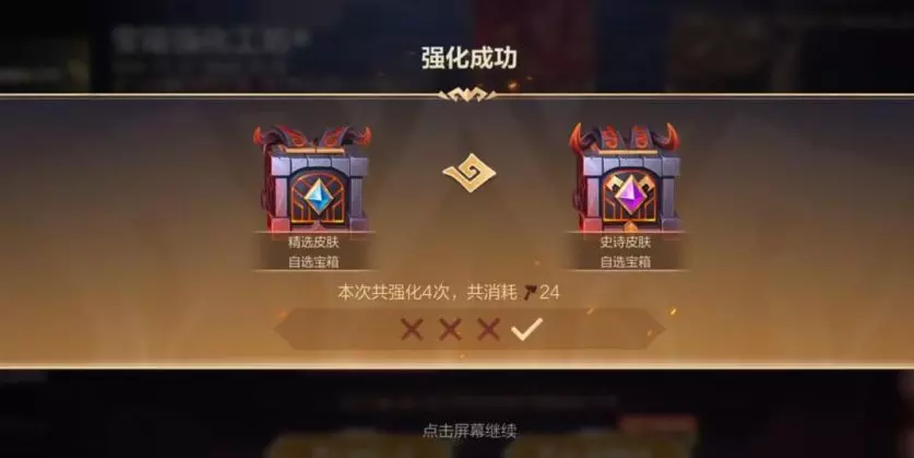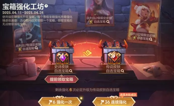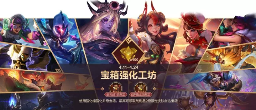 宝箱强化工坊明日开启!4月11日(明日11点陆续开启)-4月24日活动期间,召唤师使用强化锤强化升级宝箱,最高可领取2级限定皮肤自选宝箱!